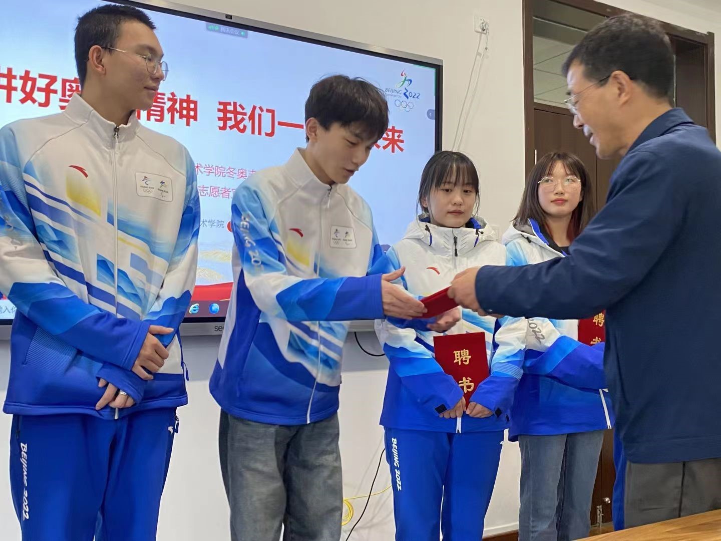 党委书记董国义代表学院党委对他们表达了诚挚的问候,为冬奥会志愿者们颁发“物理科学与技术学院冬奥志愿者宣讲团成员”聘书,鼓励同学们讲好冬奥故事,宣传冬奥文化,弘扬冬奥精神,将冬奥会所知所感所悟回馈时代。今年恰逢中共二十大的召开,希望同学们用自己的实际行动,不断彰显新一代青年人的担当,不断成就“大我”,共克时艰,共谱美好未来。