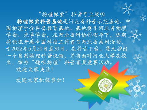为迎接2022年度全国科技活动周、全国科技工作者日的到来,物理探索科普基地联合河北省物理学会、河北省光学学会,以“弘扬科学精神,普及科学知识,传播科学思想,提高公民科学素质,增强自主创新能力,科技促进经济社会发展,提高综合国力”为引领,以“追光悟理,崇尚科学”为主题,面对新冠疫情下,学校封控管理的实际情况,开展了两场特色鲜明的线上科普活动: