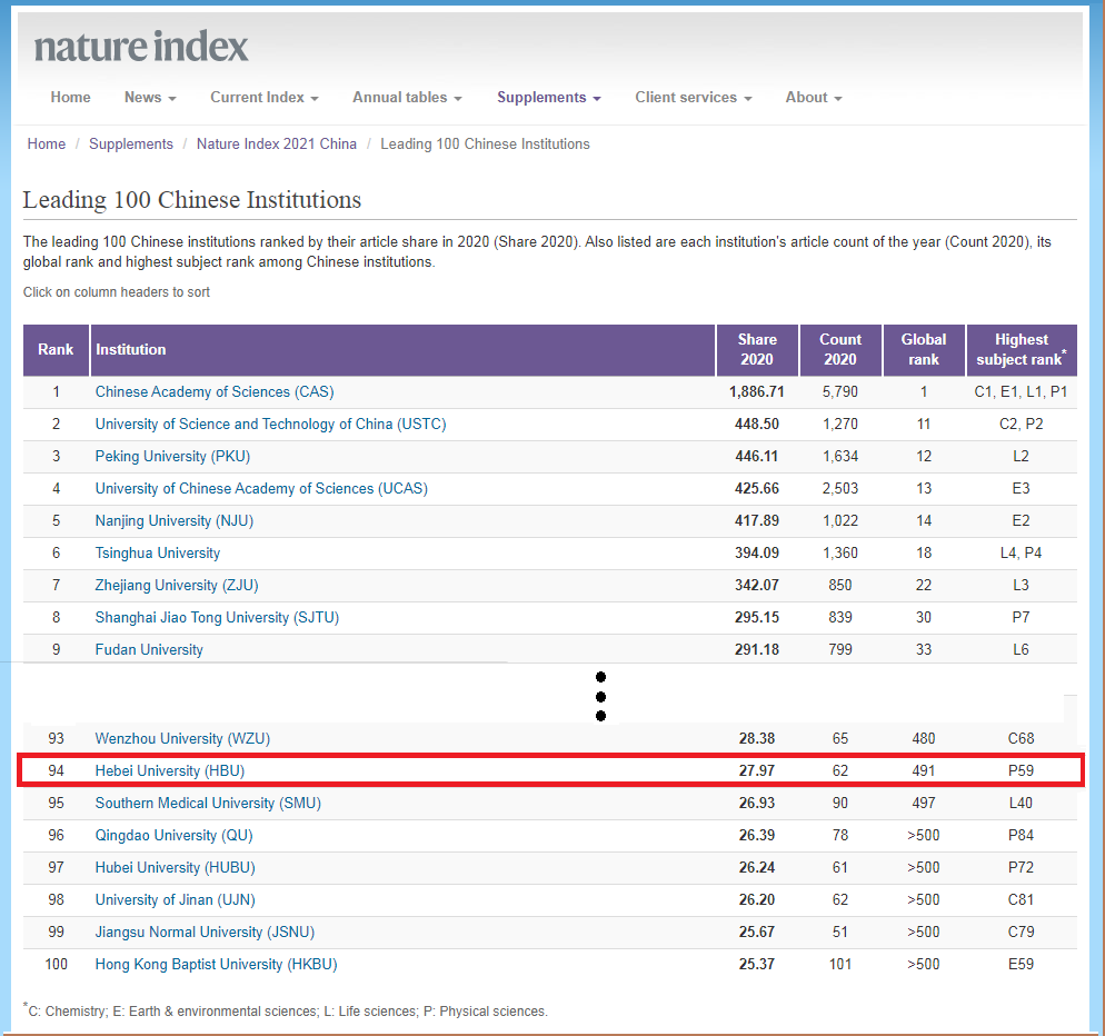 近日,《自然》(Nature)杂志出版了“2021中国自然指数”(Nature Index China)。89所中国内地大学位居中国科研机构100强,其中85所大学位居世界前500强。河北大学作为河北省唯一入选榜单的高校,分别位列中国内地科研实力最强大学的第84位和世界前500强第491位。K体育·「中国」官方网站物理学科为河北大学最好学科,位列国内自然指数排名第59位。
