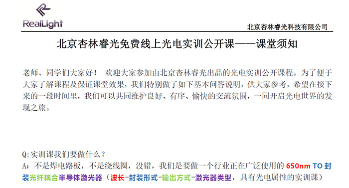 线上预演采用了腾讯会议平台。内容包括介绍光电相关产业发展及应用,帮助学生拓展视野,激发对光电行业的兴趣,培养建立学生积极的事业发展观;针对在校学生,着重分析典型光电企业人才需求标准,帮助学生认识非技术要素能力的重要性,激励学生加强自身竞争“软实力”的培养;最后通过操作演示、专业讲解,将典型光电子器件——650nmTO封装光纤耦合半导体激光器依次按照行业标准——从业规范——产品认知、设计、生产、检测——产品应用等真实工业逻辑主线展开,使学生有机会以行业从业者的视角近距离全方面的了解工程实际,提升工程认知与技能。