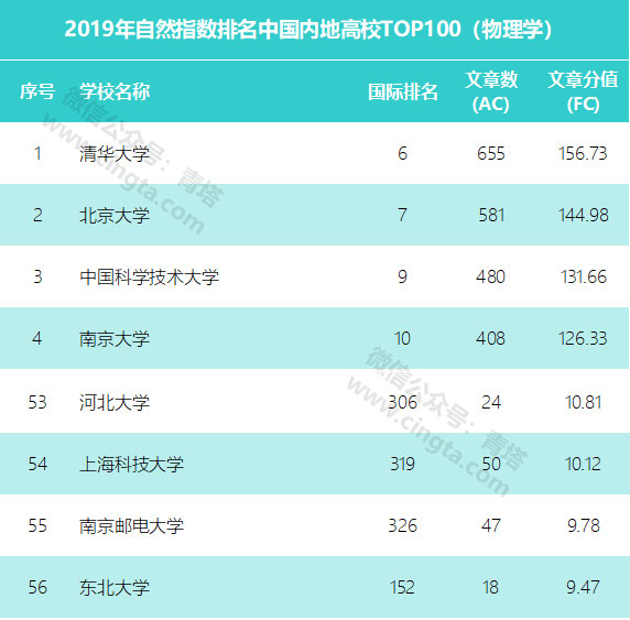 6月20日,自然指数网站更新了2019年自然指数年度排行榜(统计时间节点为2018.1.1—2018.12.31)。在物理学科排名中,河北大学以24篇文章、文章分值10.81分排在中国内地高校第53位,全球306位,较2018年全球排名上升83位。在河北省省属高校中位列第一。