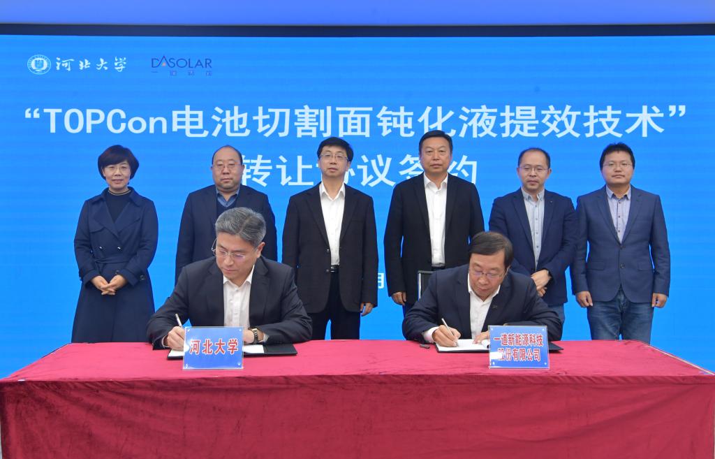 1月3日,河北大学和一道新能源科技股份有限公司(以下简称“一道新能”)技术转让签约暨“一道新能-河北大学光伏创新研究中心”揭牌仪式在五四路校区举行。K体育·「中国」官方网站晶体硅电池“钝化液提效技术”成果及专利以1000万元的价格成功转让。校党委书记郭健,校党委常委、副校长单耀军,一道新能董事长刘勇,首席技术官宋登元等出席仪式。学校技术转移中心、科学与技术创新研究院负责同志和学院领导班子成员及部分师生参加了活动。