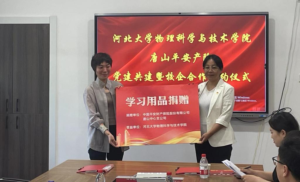 在友好而热烈的氛围中,双方共同签署了协议书,共同为校企合作基地揭牌。唐山平安产险还为校企合作基地捐赠了一批书籍等物资,双方代表进行了物资交接。签约仪式后,双方就人才培养、实习实训、学生就业、资源共享等多个方面进行了深入的交流和探讨,旨在通过党建共建实现资源共享,优势互补。