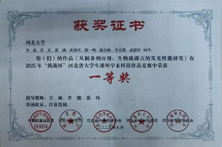 在2025年河北省大学生创新创业年会中,《非接触式高精度测温系统》获省级特等奖;《荧光碳点的制备及其在医学影像中的应用展望》获省级一等奖。