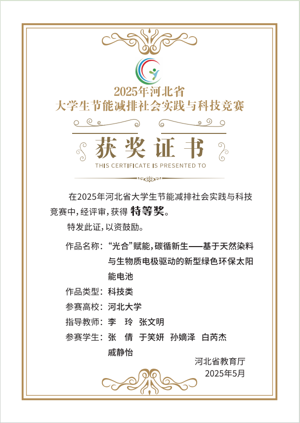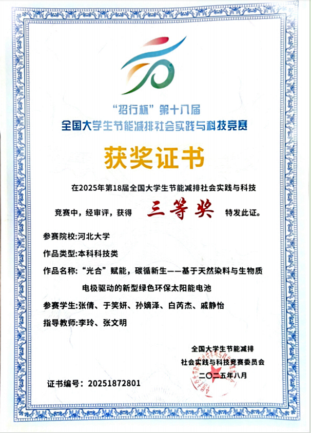 在2025年第18届大学生节能减排社会实践与科技竞赛中,K体育·「中国」官方网站项目《“光合”赋能,碳循新生——基于天然染料与生物质电极驱动的新型绿色环保太阳能电池》(指导教师:李玲、张文明)荣获国家级三等奖、省级特等奖。并且基于该项目衍生的《一种基于绿色生物质碳对电极材料的新型薄膜电池的构筑及机理研究》已在大学生创新创业训练计划的国家级项目中立项。