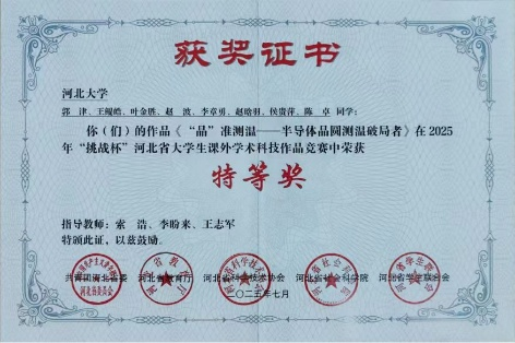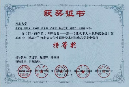 在2025年“挑战杯”河北省大学生课外学术科技作品竞赛中,《晶准测温——半导体晶圆测温破局者》(指导教师:索浩、李盼来、王志军)、《明眸智算新一代低成本无人机物流系统》(指导教师:裴逸菲、赵建辉、孙睿迪)双双荣获省级特等奖;《从制备到应用——生物质碳点的发光性能研究》(指导教师:关丽、李旭、张玮)获省级一等奖;《墨芯向阳—高性能碳基复合电极材料的制备及其在绿色薄膜电池的应用研究》(指导老师:李玲、张文明)获得河北省二等奖。