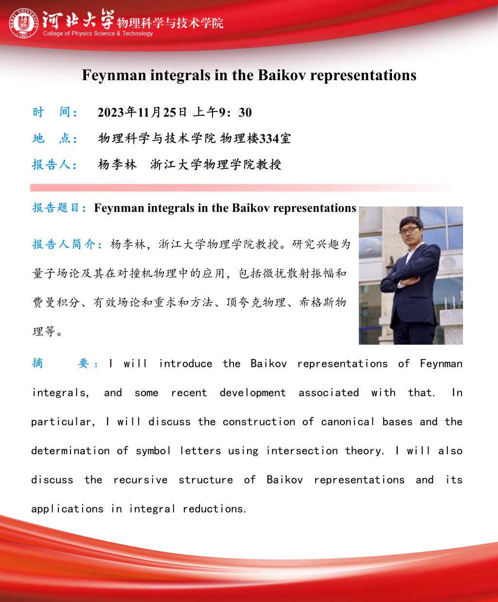 学术预告:Feynman integrals in the Baikov representations