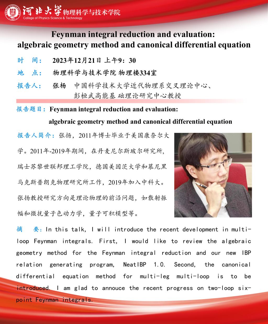 学术预告:Feynman integral reduction and evaluation: algebraic geometry method and canonical differential equation