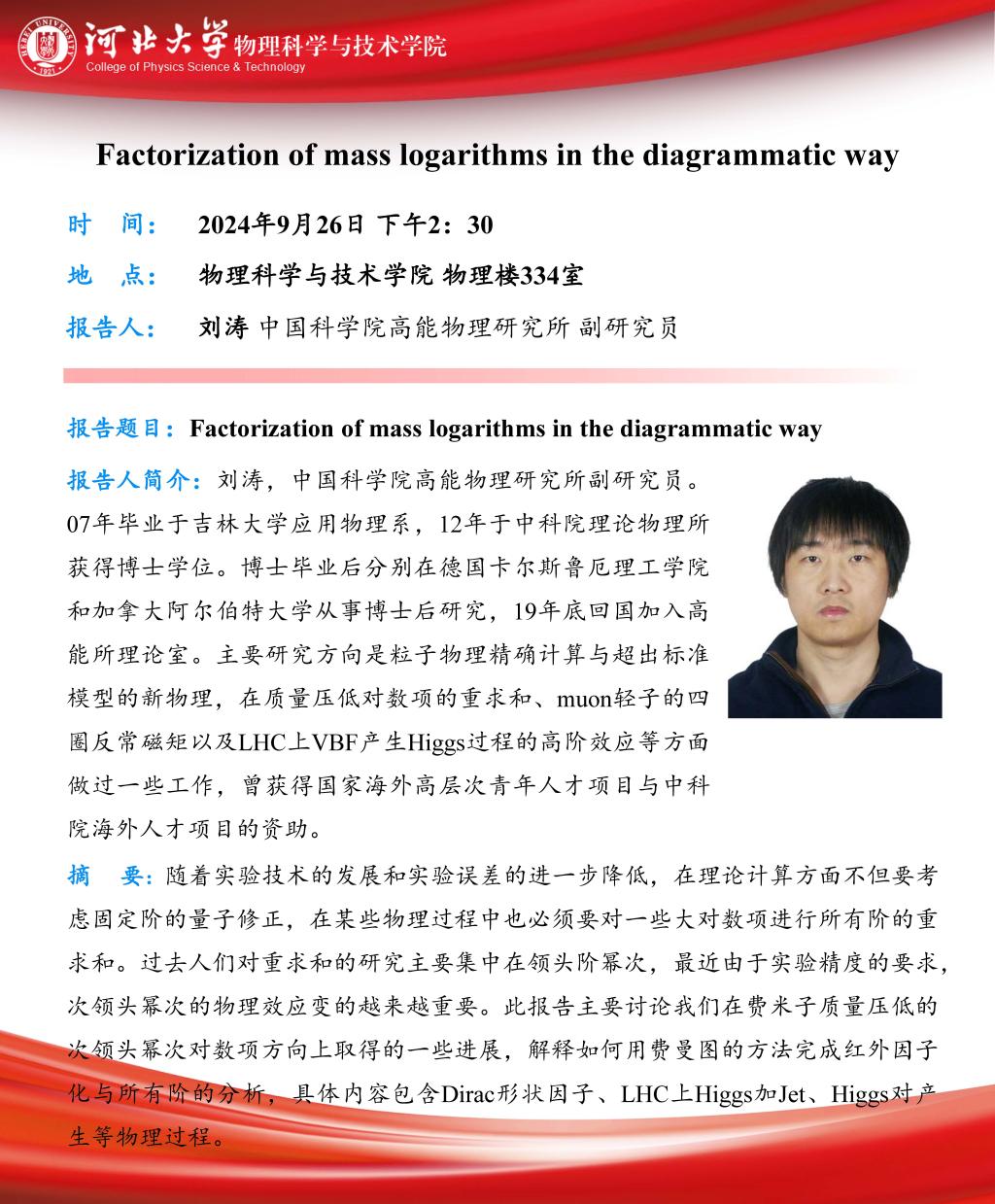 学术预告:Factorization of mass logarithms in the diagrammatic way