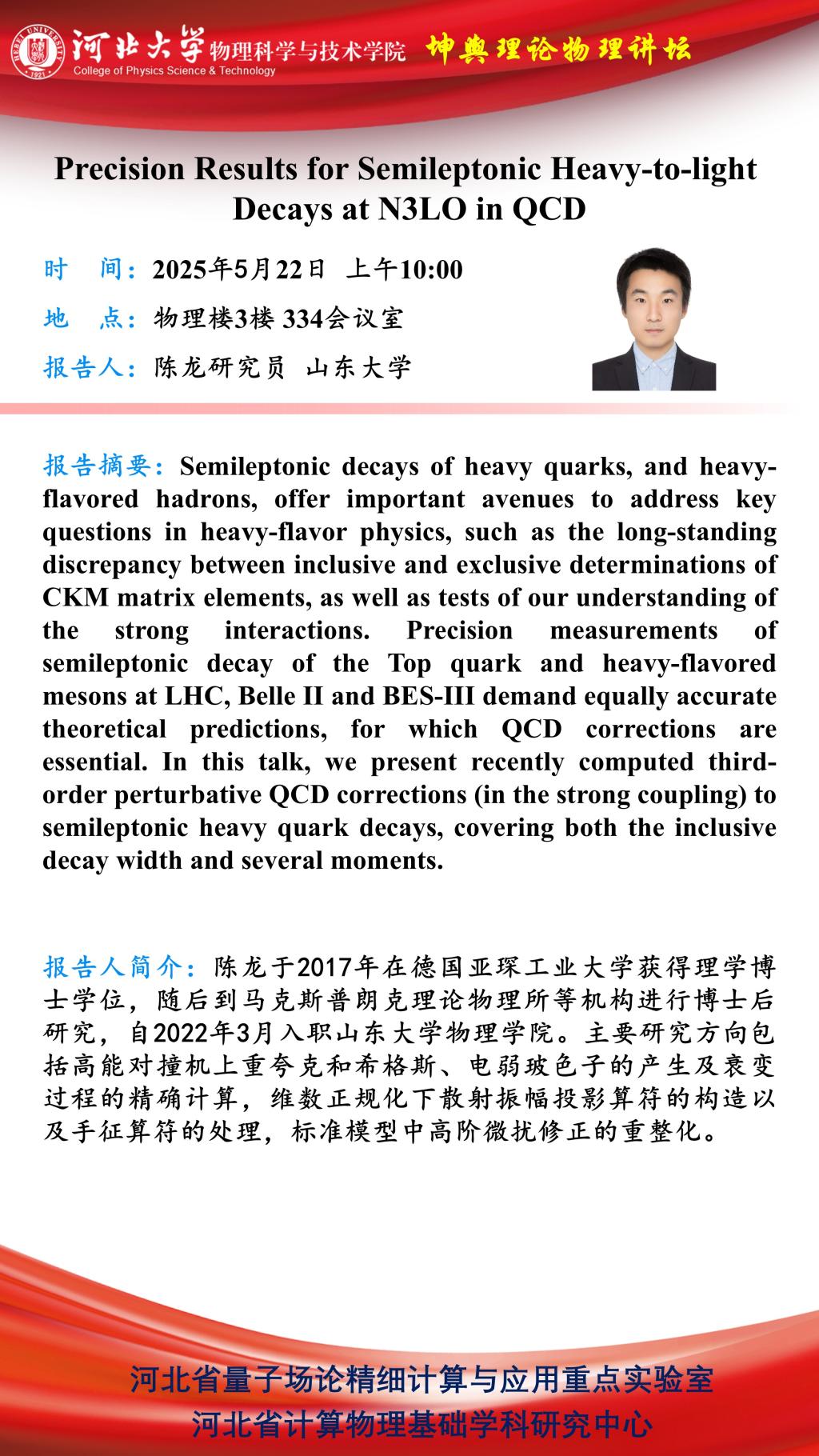 学术预告:Precision Results for Semileptonic Heavy-to-light Decays at N3LO in QCD