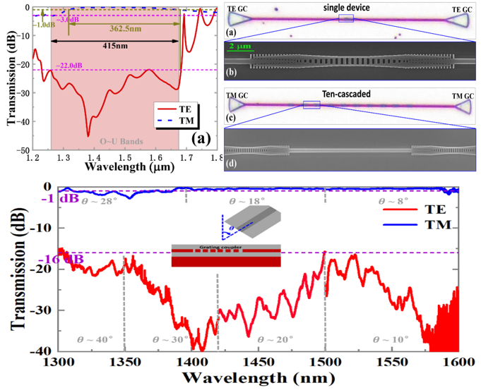 硅基光子集成芯片的偏振敏感问题是片上光信号处理过程中面临的关键挑战之一。近年来,随着通信系统高速率、大容量需求急剧增长,超大工作带宽、小尺寸硅光器件以实现光子芯片的高密度集成倍受关注。在本工作中,吴胜保等人提出了一种基于光子晶体光栅调控的弱耦合纳米线波导导波机制,打破了硅基片上TM起偏器的带宽限制。理论分析表明,该器件在449 nm的超大带宽范围内消光比大于19 dB,完全覆盖了国际电联(ITU)规定的全部光通信波段。在实验上证实了超过300 nm(受限于测试条件)工作带宽上可保证消光比大于15 dB、平均插损~1 dB,远高于此前报道的硅基TM起偏器。