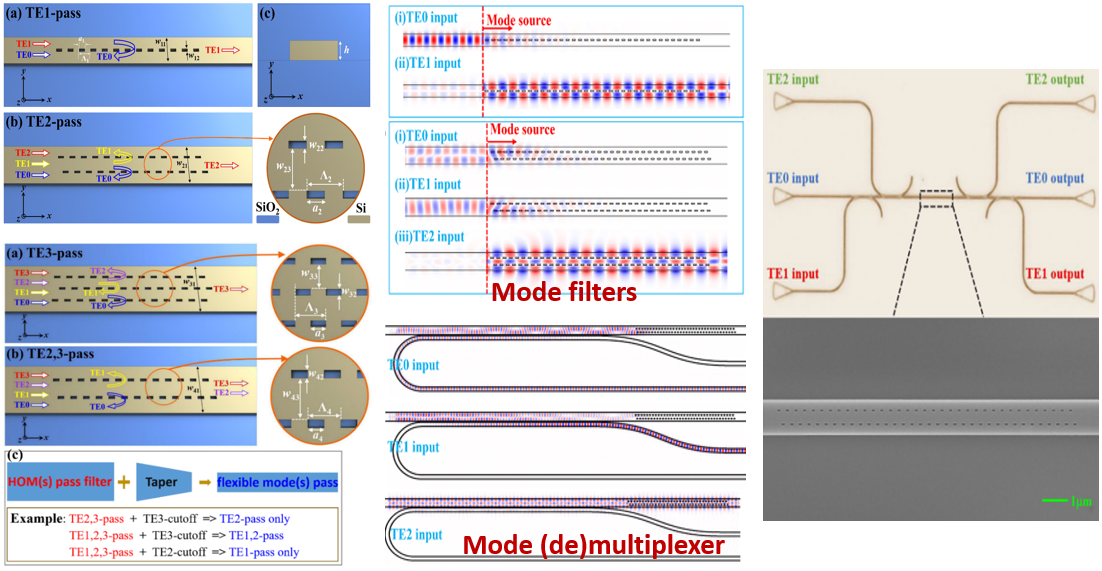 多路复用技术可直接增加信道数量,是从根本上提升现代光通信系统容量的关键技术之一。近年来,由于波分复用技术的在日益增长的需求下逐渐接近瓶颈,模分复用技术因其潜在巨大信道资源倍受关注。在本工作中,作者提出了一种基于反向模式变换光栅的模式滤波技术,不同于此前报道的模式滤波器同时只能滤除单一模式,该技术可实现多个模式的灵活滤除,设计方案具有高度的可扩展性,结构简单、加工仅需单步刻蚀。基于此技术,设计了四种不同配置的模式滤波器,并利用其中一种滤波器实现了一种超紧凑、大带宽的模式复用/解复用器。实验结果证实了其中两个典型滤波器在光通信C波段具有卓越的性能(插入损耗<1 .0db, 消光比>30dB)。该工作为模分复用芯片提供了新的设计方法和基本器件参考。