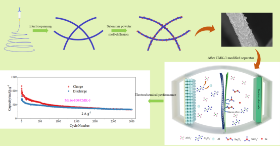 近日,K体育·「中国」官方网站先进材料与能源器件团队李战雨博士在铝电池储能机理以及研究方面取得新进展。相关工作“Novel One-Dimensional Nanofiber MnSe/CMK-3 High-Performance Cathode Material for Aluminum Batteries”在线发表在《ACS Applied Materials & Interfaces》(DOI:10.1021/acsami.2c10170),硕士研究生张琛为第一作者,吕存财博士、张文明教授和李战雨博士为共同通讯作者。
