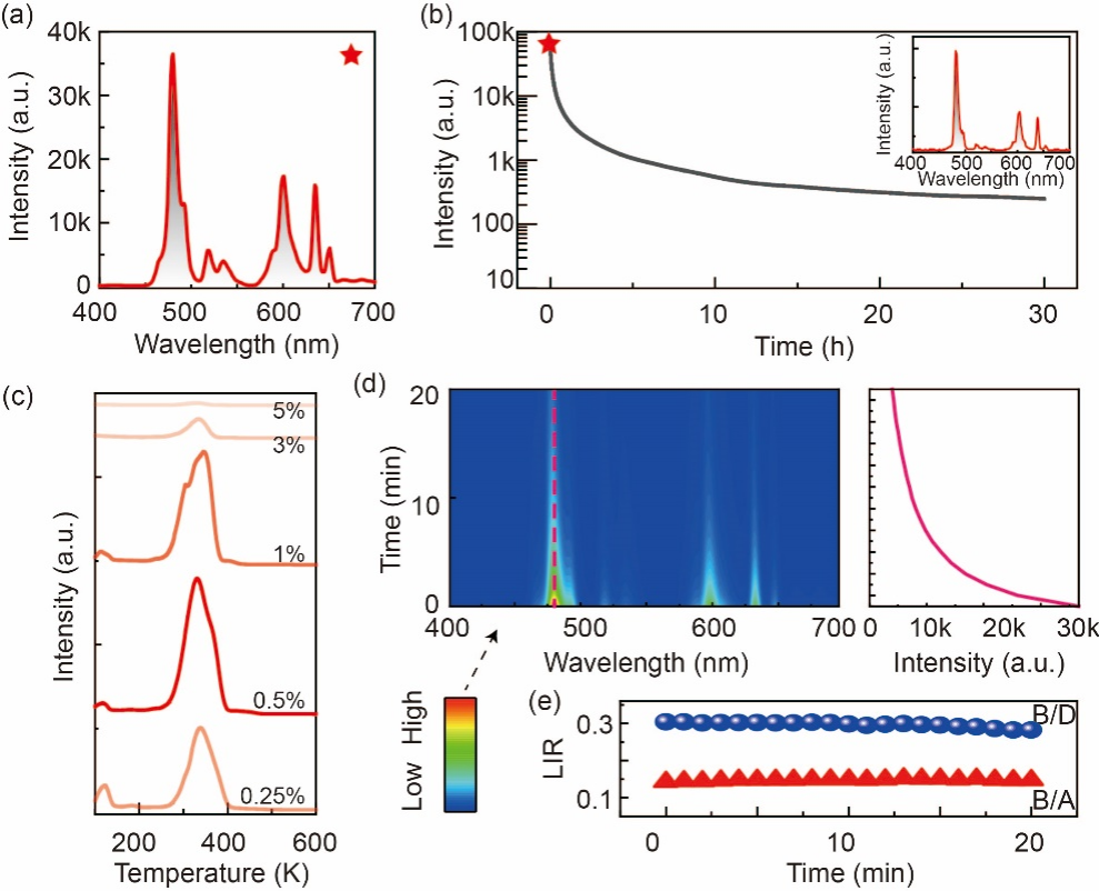 相较于传统接触式温度测量方法,荧光温度传感技术因其快速响应、非接触式工作模式等特点吸引了科研人员的关注。目前典型的荧光温度传感技术需要实时的光激励,这有可能对探测端产生干扰,包括杂散光、激光热效应等不利因素。为了解决该问题,李磊朋等人对Pr3+掺杂的SrF2荧光材料展开了研究,发现源于Pr3+的483 nm与522 nm发射线源于紧邻的两个激发态能级3P0和3P1,在X射线激发后的余辉释放过程中3P0和3P1能级上的粒子数仍然满足玻尔兹曼分布理论,因而483 nm发射线与522 nm发射线的强度比不会受到余辉信号衰减的干扰,从而构建了抗干扰的余辉温度传感策略。本工作有望为生物体内实时精准温度分布检测提供新思路。