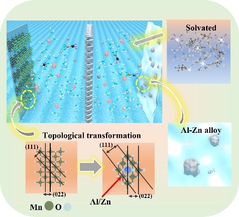 铝含量丰富,具有很高的理论容量和体积能量密度。此外,水性铝离子电池的高安全性使其成为大规模储能系统的有力候选者。然而,正极材料结构坍塌和金属铝的溶解等问题导致水系铝离子电池难以开发。在此项工作中,研究人员开发了一种新型电池系统,即Al-Zn/Al(OTF)3+HOTF+Zn(OTF)2/AlxZnyMnO2·nH2O。阴极采用MnO拓扑变换,保证阴极形成AlxMnO2·nH2O,拓扑变换改变了正极材料的结构,使Zn2+可以嵌入到AlxMnO2·nH2O尖晶石结构中,为材料结构提供支撑。阳极上,电解液中的 Zn2+在Al负极上沉积,形成区域性的 Al-Zn合金,避免金属铝的溶解问题。Zn2+在放电过程中被还原为Zn金属,为二次放电增加了一个平台,有利于电池容量的提高。该系统可提供1.6 V的放电平台,首次放电容量达到554 mAh/g,且在100次循环后保持313 mAh/g的高可逆容量。该研究为水系铝离子电池(AAIBs)的进一步发展提供了新思路。