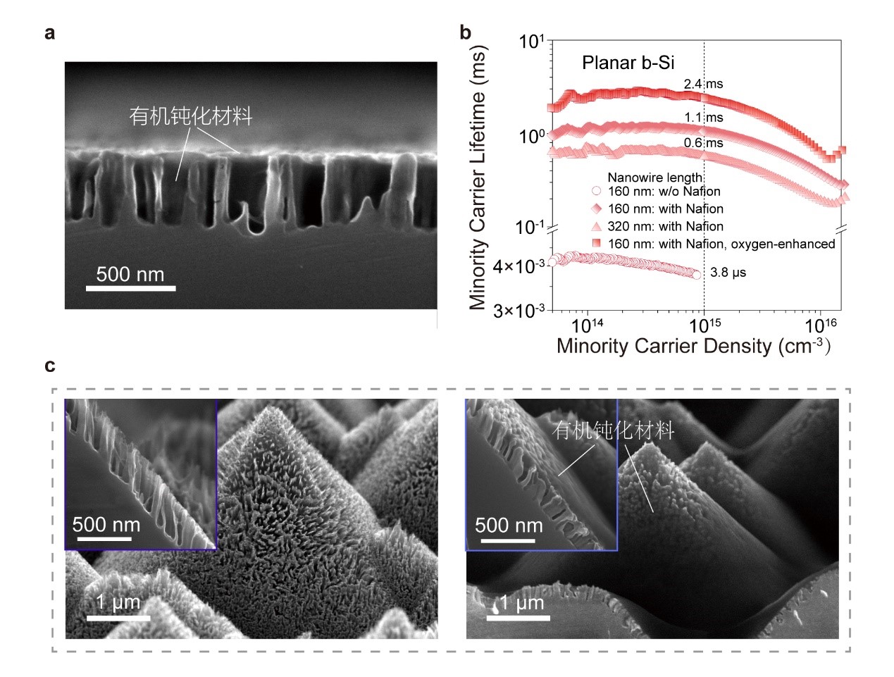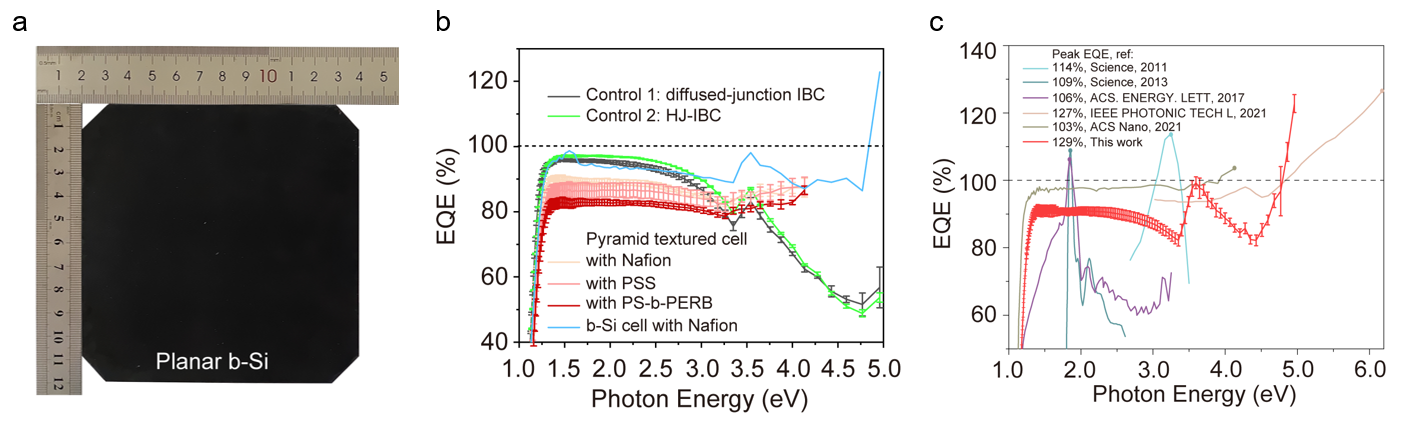黑硅,即硅的纳米阵列结构,在硅半导体材料与器件的发展史上一直备受关注,其理想的光吸收特性使其成为完美光伏材料。但同时纳米结构造成大的比表面积,致使其表面复合远大于常见的金字塔陷光结构,因此目前黑硅电池未能走向实际应用。国内外研究机构一直致力于解决这一问题,但由于缺乏有效的钝化技术而未能制备出高质量器件。2017年,陈剑辉课题组发现了经典钝化机理(化学钝化和场效应钝化)之外的第三种新型钝化机制—电化学钝化,由于其溶液法的特殊工艺可以很好地渗透进入纳米多孔结构,为解决黑硅钝化问题提供了新的思路。另一方面,硅材料自身能带结构中固有的“逆俄歇效应”可以实现“1光子产生2个及以上电子空穴对”的反常光伏效应,从而获得超过100%的外量子效率(EQE>100%)。但这一反常光伏效应的实现需要满足两个条件:高能光子的低反射率和低复合损失。而黑硅正好可以提供降低电池表面反射率,黑硅钝化将将实现低的复合损失。对此,研究团队基于溶液法电化学钝化机制的有机钝化液渗透钝化技术获得了>2 ms的钝化效果,并在效率>21%的黑硅太阳电池中观察到了EQE超过100%的反常光伏效应的实验结果(峰值EQE达129%)。