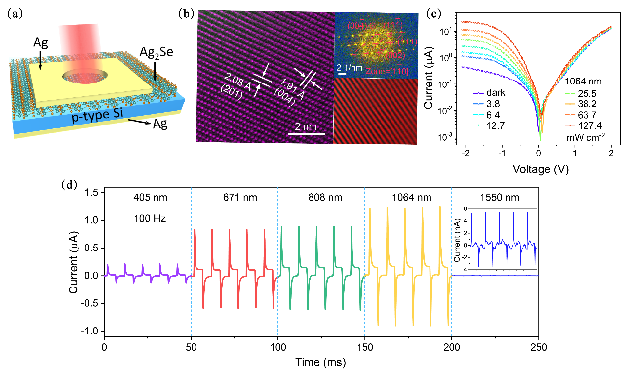 基于热释电效应、光激发和半导体三者之间相互耦合的热释电光电子学效应可通过光诱导出的热释电极化场调控载流子的光电过程,从而提升器件光响应性能。金属硫族化合物Ag2Se具有高温相和低温相(相变温度~400K),其中高温相是快离子导体,低温相是窄带隙半导体。作者发现低温相Ag2Se薄膜具有优异的热释电性能,这可能源于其室温下正交相和单斜相共存的结构特性。通过构筑n-Ag2Se/p-Si异质结光探测器,将Ag2Se的热释电效应与异质结的光伏效应相结合,利用热释电光电子学效应极大提升了器件光响应特性。实验结果显示该探测器在零偏压下具有从可见(405 nm)到近红外(1550 nm)波段的宽谱响应,对于1064 nm的近红外光辐照,相比单一光伏效应诱导的响应性能,探测器的响应度和探测率提升了1425%,分别达到43.32 mA/W和1.75×1011 Jones,并获得超快的响应速度(64/62 ms)。该工作对于开发新型高性能自驱动宽波段光探测器及红外超快光探测器均具有较重要的意义。