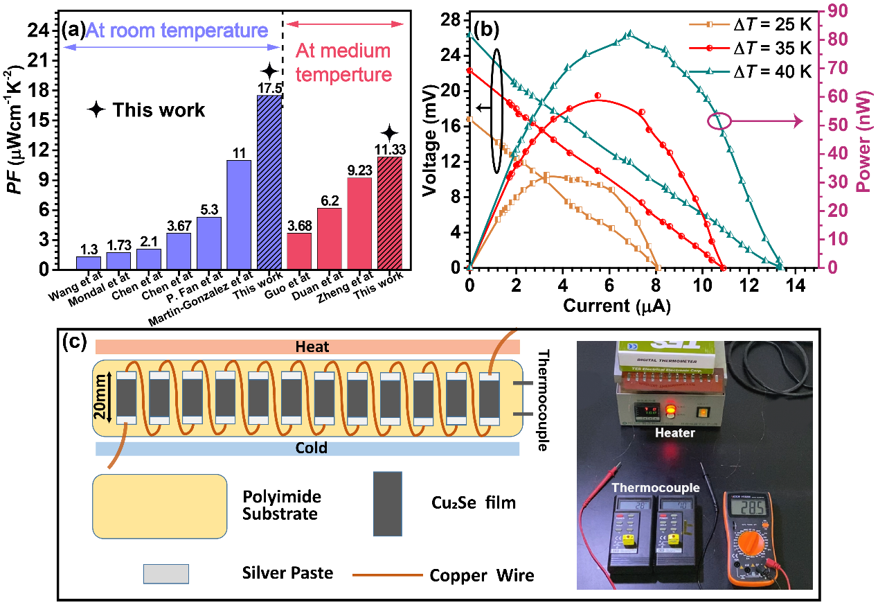 Cu2Se和InSb均为绿色环保的窄带隙二元化合物半导体材料,其中Cu2Se是一种典型的“电子晶体-声子液体”热电材料,近年来备受科研人员关注。目前关于Cu2Se热电性能优化的研究多集中在高温快离子β相,而对其低温α相的研究较少。相比于高温β相,工作在近室温区的α相更具应用前景。K体育·「中国」官方网站能量转换材料与器件课题组李志亮博士、硕士研究生王景玄等人利用脉冲激光沉积技术加原位退火工艺,在PI衬底上获得了高度取向的α-Cu2Se纯相薄膜,该薄膜室温功率因子PF约为17.6 μW cm–1K–2,远优于目前Cu2Se多晶块体报道的PF值。基于此薄膜,作者设计制作了α-Cu2Se基柔性热电薄膜器件,在40 K的温差下,该器件输出的最大功率密度高达~10.2 W m–2,表明α-Cu2Se在自供电柔性可穿戴电子设备领域具有重要应用前景。相关工作以“Flexible oriented α-Cu2Se films and devices with remarkable power factor and output power at near-room temperature”为题发表在Materials Today Physics(2023, 31:100994, IF =11.02), 李志亮、王景玄为共同第一作者,王淑芳教授为通讯作者。