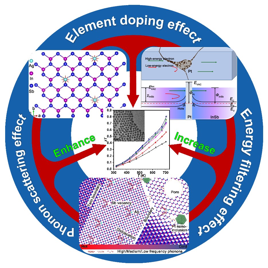 在另一项工作中(Materials Today Physics 2022, 27:100818),他们利用纳米复合策略优化了InSb半导体块体材料的热电性能。InSb在室温下的带隙约为0.18 eV, 电子迁移率高达104-105 cm2V-1s-1,具有优良的电学性能。但InSb的热导率较高,制约了其在热电领域的应用。该课题组博士研究生王晴等人将Ag/Pt纳米颗粒引入到N型InSb块体材料中,在不影响其电学性能的前提下,利用纳米颗粒对声子的强烈散射大幅降低了N型InSb的晶格热导率,提升了其热电性能。相比于纯相的InSb,复合2% Ag/Pt纳米颗粒的InSb样品的ZT值提升了近93%,在703 K时达到了0.83,是目前N型InSb热电性能报道的最好结果之一。王晴为该论文的第一作者,李志亮博士和王淑芳教授为通讯作者。