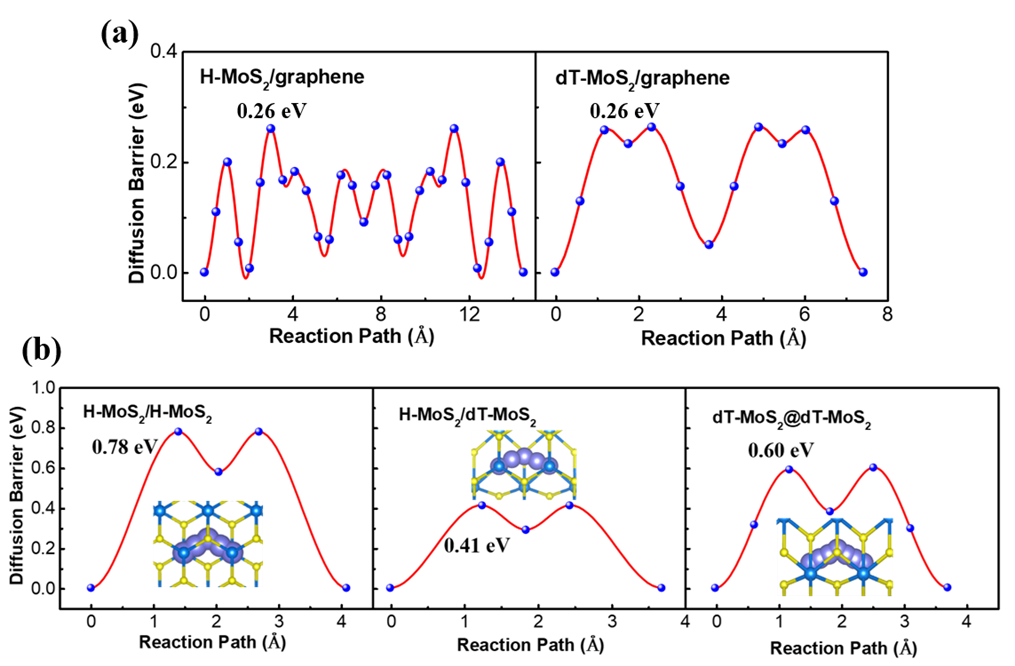 二维材料(如graphene、MoS2和MXene)之间的范德华斯间隙(vdW gap)为锂离子提供了天然的扩散通道。据报道,锂在MoS2/graphene异质结构间隙和MoS2/MoS2同质结构间隙中的插层行为不同,但基于MoS2的异质结构的插层和扩散机制,以及储能异质结构设计的一般思路,都需要进一步研究。作者的计算结果表明,扩散过程中锂周围的近邻原子构型、层间电荷分布以及通道宽度等因素影响扩散势垒大小。此外,MoS2/graphene异质界面使得MoS2更容易向dT相转变,dT-MoS2为锂扩散提供了更宽的通道。在此基础上,作者提出通过范德华通道设计,优化锂离子的储存和扩散性能,为二维材料异质和同质结构的储能研究提供了理论参考和新思路。