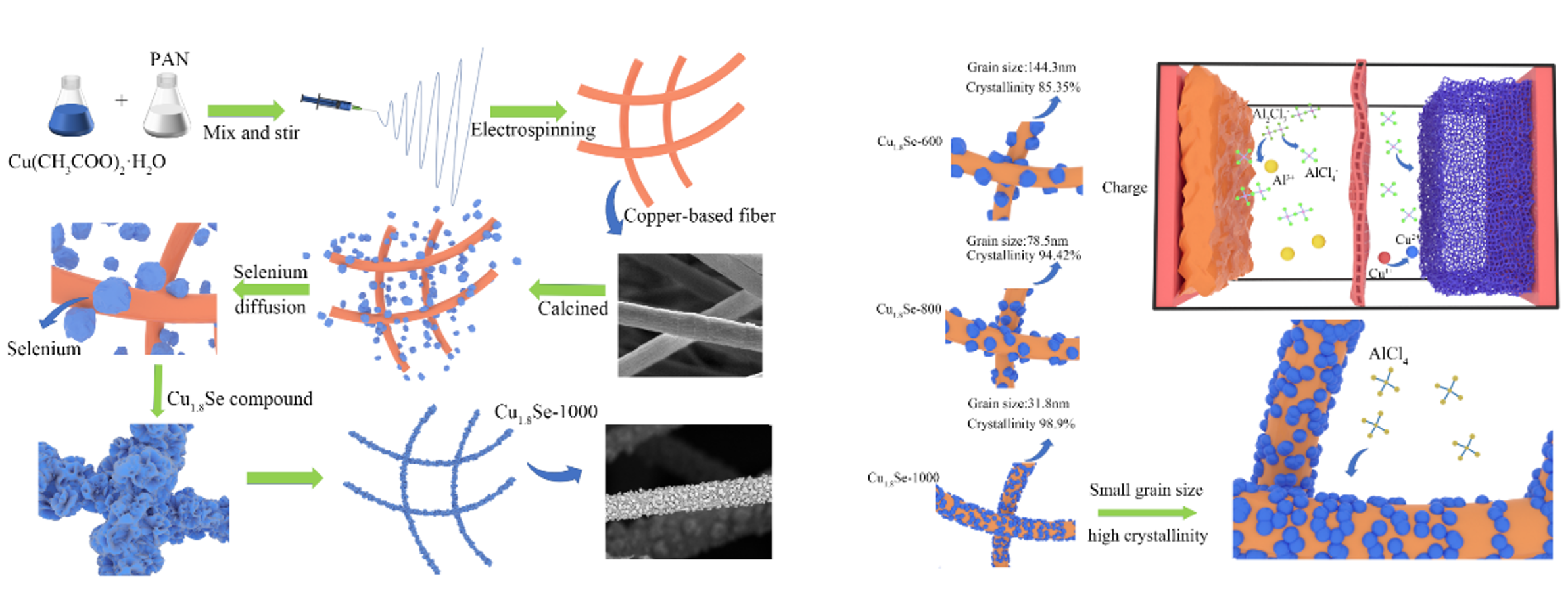 铝含量丰富,具有很高的理论容量和体积能量密度。制备具有理想动力学的阴极材料对于提高铝离子电池(AIB)的电化学性能具有重要意义。过渡金属硒化物作为铝离子电池正极材料表现出高能量密度和长循环稳定性的优点,可以在电化学反应中提供大量的电子转移。因此,研究团队通过静电纺丝和高温硒化制备了一维Cu1.8Se纳米纤维,通过改变硒化温度研究其结晶度和晶粒尺寸变化,发现Cu1.8Se-1000的结晶度最高,晶粒尺寸最小。高结晶度意味着高比例的结晶区域,并且由于分子在三维空间中的有序排列,晶体结构有助于离子的嵌入/脱出。因此,Cu1.8Se-1000表现出优异的电化学性能:在2.0 A/g电流密度下其首次初始容量为410 mAh/g,且在5000次循环后仍然为152.12 mAh/g。另外,获得的正极材料组装成软包电池可以在任意折叠状态下点亮LED灯,本研究成果揭示了这种新型正极材料在可穿戴设备中的应用前景。
