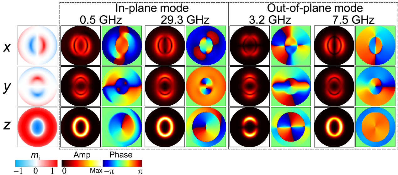 磁Skyrmion作为一种具有拓扑保护性质的自旋结构,因其在自旋电子器件的潜在应用而受到广泛的关注。早期研究证明圆形Skyrmion在面内和面外微波磁场的激发下分别表现出旋转模式和呼吸模式。然而,各向异性DMI的存在使得Skyrmion的形状由圆形拉伸为椭圆形。作者通过研究椭圆Skyrmion在纳米圆盘中的自旋波模式,发现椭圆Skyrmion的面内自旋波模式包含逆时针和顺时针两种旋转模式;而对于面外自旋波模式,由于其自旋纹理旋转对称性的破坏,Skyrmion的呼吸模式劈裂为两种复杂的呼吸模式,即顺时针旋转和呼吸的混合模式,以及各向异性呼吸模式。该研究结果有助于理解Skyrmion丰富的自旋进动模式,以及其在自旋电子学中的应用。