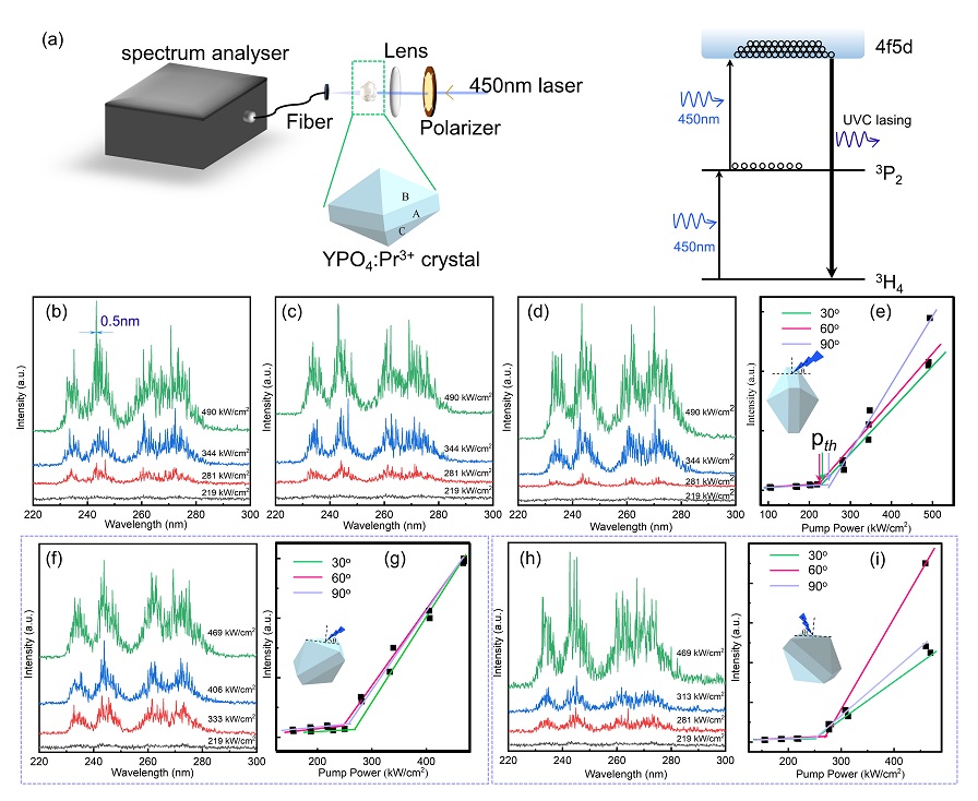 紫外固态光源,特别是短波紫外波段,在高密度光学数据存储、生物医学研究以及水和空气净化和消毒等方面的潜在应用引起了人们的极大关注。上转换技术作为产生固态短波长激光器的手段之一,可以将低能光子转化为高能光子。这种方法结构简单,而且不需要严格的相位匹配条件。 然而由于多光子吸收过程中较高的无辐射跃迁几率,短波上转换紫外激光仍然难以实现。杨艳民团队利用450 nm蓝色激光激发,通过双光子吸收成功地从 Pr3+ 掺杂的YPO4 晶中获得了UVC 随机激光,其中波长范围为230-250 nm的UVC随机激光也是目前上转换激光发射的最短波长。