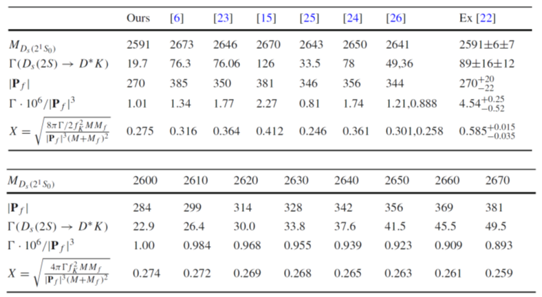 2021年初,欧洲核子中心LHCb实验组发现了新粒子Ds0(2590),并指出它是粲夸克和反奇异夸克构成的赝标量介子Ds(11S0)的径向激发态Ds(21S0)。在此粒子发现之前,已经有很多理论预研究了其质量和宽度,部分宽度值表面上与实验符合的较好。研究发现,在阈值附近的强衰变过程,理论给出的宽度显著依赖于质量值,因此不同质量计算出的宽度差别很大,无法直接对比。为了解决这个问题,作者引入了一个新的物理量X,此物理量几乎是与质量无关的,因此能够给出不依赖于质量的可靠预言,解决了不同质量前提下宽度无法准确对比的问题。研究发现,与表面现象不同,所有的理论宽度值实际上都与实验相去甚远,其X值都远小于实验给出的X值,所以认定此新粒子是Ds(21S0)还需要更多的理论和实验研究。