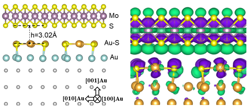 异质结是现代电子与光电器件的核心,二维半导体用于电子器件有望超越摩尔定律,近年来引起人们广泛的关注。作者在前期二维半导体准键研究的基础上,将准键研究扩展到金属-二维半导体异质结。在金属/半导体异质结的界面,金属表面重构经常发生。近期的实验报导了TMDCs(MoS2、WS2)在富硫条件的CVD生长过程中会引起金表面的硫化重构。通过密度泛函理论计算,作者发现重构界面存在类共价准键作用,导致在价带顶出现了显著的准键诱导的能隙态,从而形成了势垒较低的p型肖特基接触;准键对肖特基势垒的影响甚至可能超过界面偶极的作用。此现象不仅发生在硫重构金属/TMDCs界面,预期也普遍存在于硒重构、甚至氧重构的界面中。该工作为降低金属-二维半导体异质结的肖特基势垒高度提供了一个新途径,从而有助于解决二维半导体器件中接触电阻大这一难题。