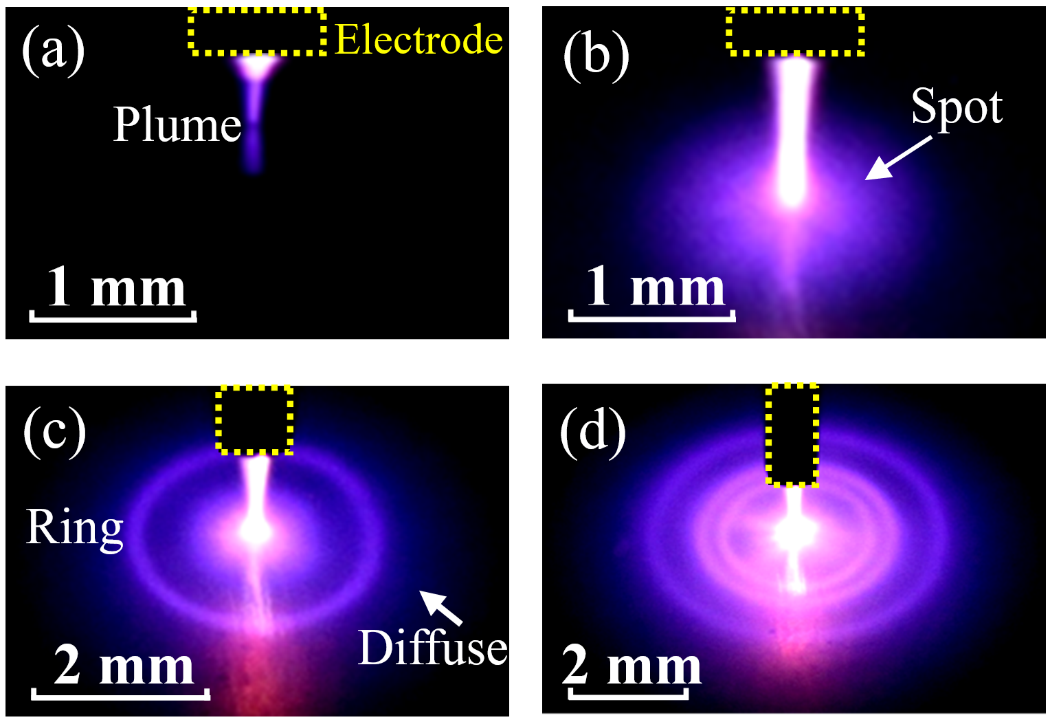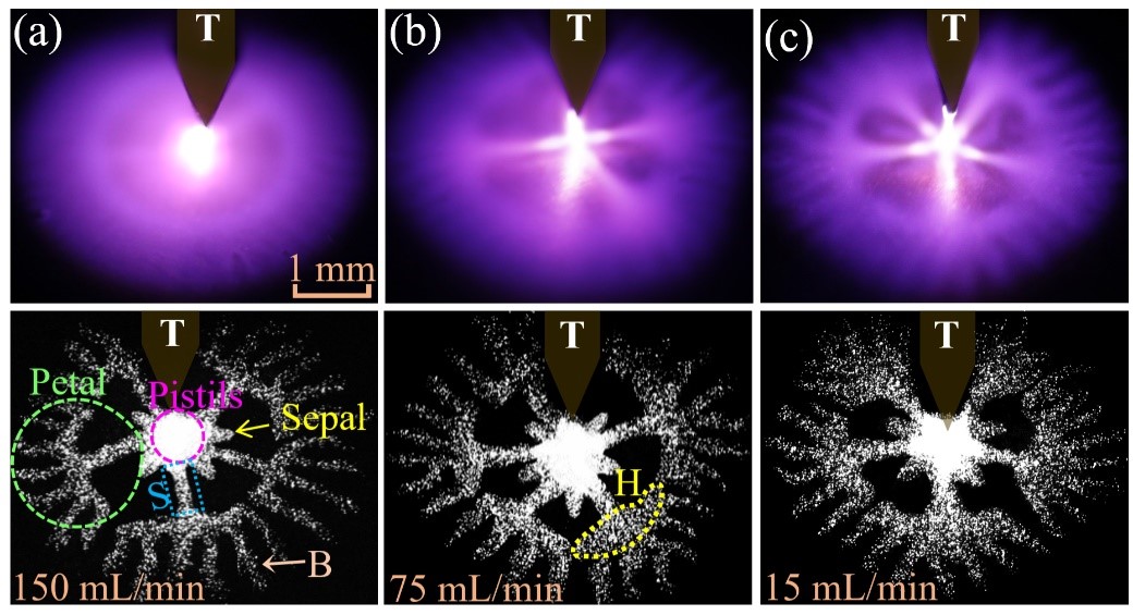 等离子体射流能在开放的空间产生等离子体羽,富含丰富的活性粒子,在表面改性,生物医疗,材料生长,流动控制等诸多领域都有广泛的应用。在实际应用中常在射流下游放置待处理的材料(基底),这会影响等离子体羽的放电特性。该团队利用氩气射流,在硅胶板基底的表面产生了几种放电斑图:当氩气流量较大时,发现了弥散点、单环及三环斑图(Plasma Process Polym. 2019, e1900073);随着氩气流量的减小,还发现了花瓣状斑图(Plasma Process Polym. 2022, e2200003)。其中,三环斑图和花瓣斑图是首次被发现的。快速照相表明,这些斑图都是由正、负流光的时间叠加形成的,其中负流光都是弥散的,而正流光则存在分叉、绕行、穿插等复杂的传播行为。此外,正流光的重复性随氧气含量的增加而有所改善。这些结果对揭示等离子体射流中流光的传播行为具有重要意义。