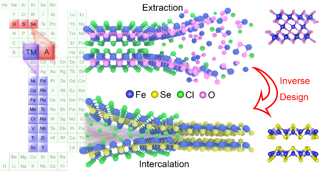 氯离子电池(CIB)具有优秀的储能特性。近年来,过渡金属氯氧化合物(TMOCl)由于其层状结构和在有机电解质中的高稳定性,成为CIB正极中最具吸引力的材料之一。但在放电过程中,低Cl含量下的TMOCl会发生转化反应,从而对CIB的循环性能和能量密度产生不利影响。为了消除转化反应,作者采用高通量筛选结合逆向设计的方法在过渡金属氧族化合物中探索新型CIB正极材料。基于动态稳定性、热力学稳定性和Cl-结合能力等综合评估,最终筛选出的FeSe具有拓扑稳定的Fe-Se框架,能够完全避免低氯离子浓度下正极的分解和重构行为。在循环过程中,连续的Cl-插层反应保证了接近3.2 V的平稳电压平台。由于FeSeCl的3d-4p轨道杂化的增强,FeSe的金属性质在FeSeCl相中得以保持。从动力学性质上看,FeSe和FeSeCl中Cl-迁移能垒较小,分别为0.13 eV和0.28 eV。该工作为阴离子电池体系的电极材料开发设计提供了重要理论探索方案。