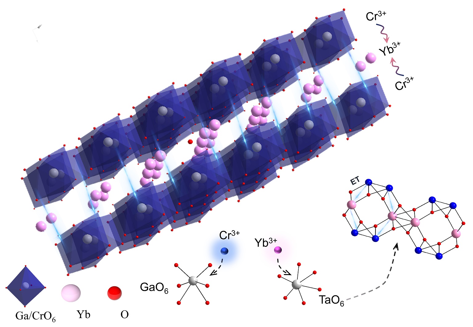 近红外LED凭借在安全监测、食品安全、现代农业、夜视、光伏领域、医疗诊断等方面具有许多潜在应用而受到广泛关注。但是,目前报道的近红外发光荧光粉仍然存在发光效率低、半峰宽窄、热稳定性差等不足,一定程度上限值了其商业化应用。基于此,依靠基质自身的层状结构,构建致密稳定的能量传递对,使得GaTaO4:Cr3+/Yb3+近红外发射的内/外量子效率、半峰宽和热稳定性得到了显著提高。研究团队进一步将荧光粉制备成小型近红外发光二极管,在无损食品检测、夜视、静脉显示等方面充分展示了其应用潜力。这些结果为设计具有理想发光性能的NIR发光材料提供了新颖的切入点。
