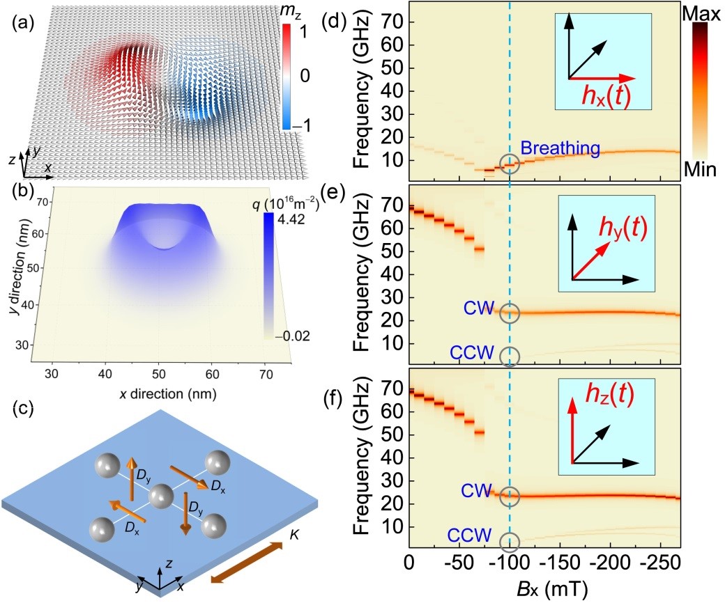 磁Bimerons作为一种新型自旋结构,被认为是磁性Skyrmions的平面内拓扑自旋纹理。作者通过微磁学计算研究受限纳米点中单个Bimeron 的共振激发和自旋波模式,证明了Bimeron具有不同于Skyrmion的独特共振现象。例如,在面外微波磁场的激励下,Bimeron的自旋波模式不再是呼吸模式,而是包含低频的逆时针(CCW)模式和高频的顺时针(CW)模式。当施加以不同角度旋转的面内微波磁场时,Bimerons的自旋波模式具有各向异性,即在x方向表现为呼吸模式,在y方向表现为CCW和CW的方位角模式。此外,在特定角度施加面内微波磁场时,呼吸模式、CCW模式和CW模式被证明可以同时出现在共振激发谱种。除了三种典型的自旋波模式外,由于自旋纹理的旋转对称性被破坏,两种高相位的CW模式会导致Bimeron的周期性变形。研究结果不仅揭示了 Bimerons 丰富的自旋波共振,还有助于其在自旋电子学和磁子学中的应用。