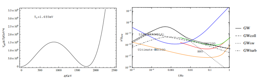 论文研究了B-LSSM模型下,强一阶相变产生的引力波谱以及考虑单圈零温度有效势修正的希格斯粒子和次轻希格斯粒子质量的分布情况。具体推导了与两个U(1)B-L希格斯单态相关的有限温度有效势,分析发现,该有效势满足产生强一阶相变的条件vc/Tc>1。作者进一步讨论了如何通过强一阶相变产生引力波谱。利用数值方法求解成核温度Tn时相变速度β,能动量张量求解方法计算强度参数aq。通过对B-LSSM参数空间进行微调,可以得到强度参数(aq~0.14),速度与哈勃速率的比值(β/Hn~5)。基于以上研究结果,我们观测到引力波的主要贡献来自于声波,引力波信号约为h2ΩGW~10-9,这与目前的实验结果吻合得很好。