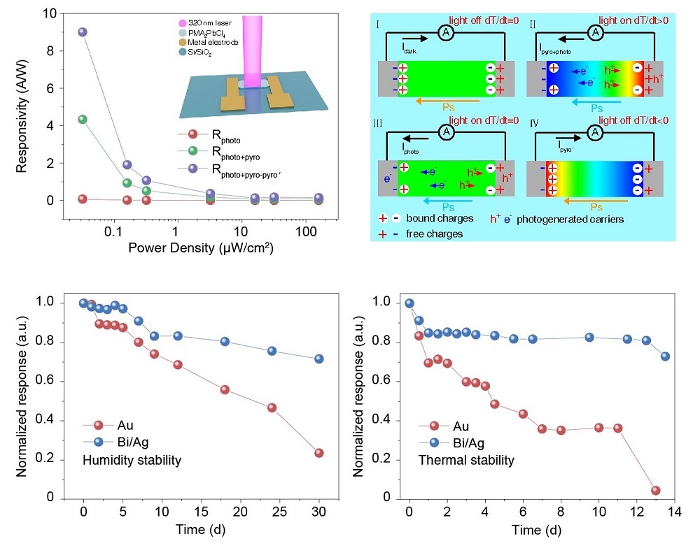 作者选用宽带隙(3.65 eV)的二维氯基钙钛矿铁电材料PMA2PbCl4作为紫外光探测材料,采用空间限域反溶剂结晶法,可控制备了PMA2PbCl4单晶微米带,并构建了基于肖特基接触的M-S-M结构光电探测器件。利用铁电-热释电光电子学效应,通过光照下肖特基结区的极化电荷变化调控势垒高度,实现了对320 nm紫外光的快速、高灵敏和自供电探测,最低探测功率小于1 nW。在自供电工作模式下,该探测器响应度达到9 A/W。在使用铋/银电极取代传统使用的金电极后,由于铋具有较大的扩散能垒,不易腐蚀钙钛矿,该光电探测器表现出了较好的耐湿度、耐光照和热稳定性。