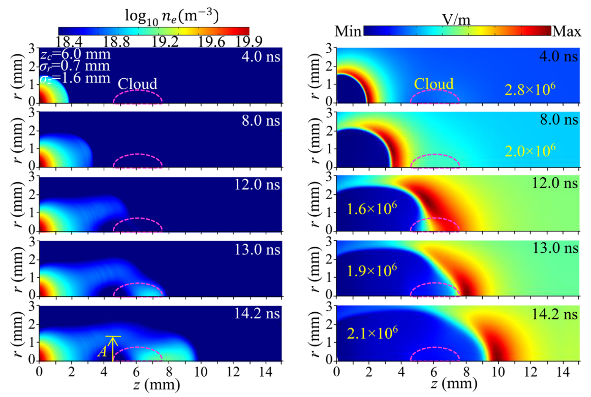 图2:模拟正流光遇到正离子团蛇形传播行为时的电子密度和电场空间分布
