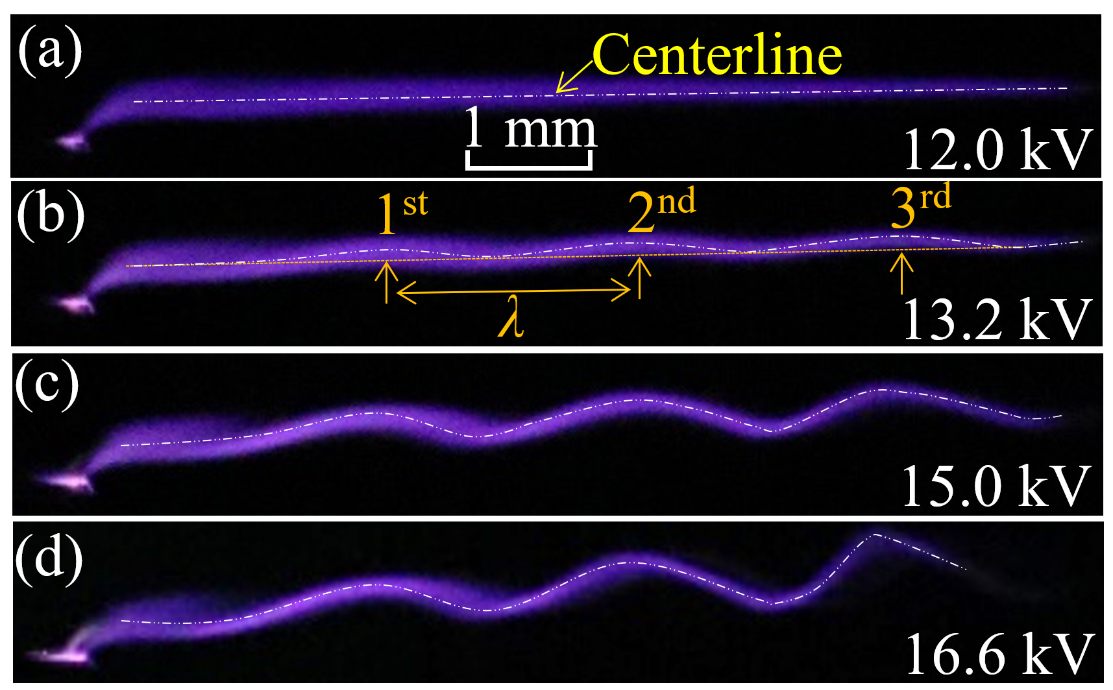 等离子体射流能在开放的空间产生等离子体羽,富含丰富的活性粒子,因此在表面改性,生物医疗,材料生长,流动控制等诸多领域都有广泛的应用。一般而言,等离子体羽为锥形,是由沿直线传播的流光形成的。该团队在实验中发现了具有单胞结构的等离子体羽,快速照相表明单胞是源于正流光的绕行行为(Phys. Plasmas 2021, 28, 103507)。除此之外,实验还发现了外加电压较高时,正流光会沿蛇形轨迹传播(Phys. Plasmas 2021, 28, 073501)。实验推测正流光的绕行行为和蛇形传播是残余的正离子团影响造成的。对此,该团队利用二维流体仿真详细地模拟了不同密度的正离子团对氩等离子体射流中正流光蛇形传播行为的影响。