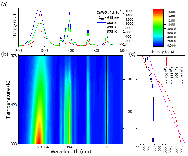 基于荧光强度比策略的温度传感技术由于其强大的抗干扰性和非接触的工作模式在生命科学等领域展现出了潜在的应用价值,近年来受到了科研人员的广泛关注。相较于传统基于单激发-双发射模式的荧光强度比技术,近期开发的基于双激发-单发射策略的新型荧光强度比技术更具成本优势。该工作中作者设计了一种新型的双激发-单发射测温方法,实验发现:当直接激发Eu3+的4f 能级时,Eu3+的4f→4f 红光跃迁呈现热猝灭规律,这归因于多声子无辐射弛豫的增强;当激发W-O和Eu-O电荷迁移带的右侧带边时,Eu3+的4f→4f 红光跃迁能够有效抵抗热猝灭,这归因于电荷迁移带的温升红移,结合这两种物理机制进而构建了双激发-单发射的测温方法。考虑到电荷迁移带的温升红移,激发波长直接影响了Eu3+的4f→4f 红光跃迁的温度响应,因而可以通过选择不同的激发波长来实现灵敏度的可调谐性,为开发新型荧光温度传感方法提供了思路和参考。