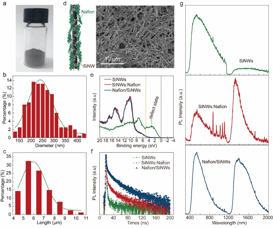 器件高效率的核心是有机钝化技术对“低维(碳纳米管)/硅”界面的高质量钝化效果。该课题组将这一钝化技术拓展到一维硅纳米线。经过一年多的工艺摸索,在实验室制备的可调控的硅纳米线粉末[图3a, b, c]基础上,采用旋涂技术原位制备了“硅纳米线-有机钝化”复合薄膜[图3d],显著改善了薄膜的缺陷态密度、荧光寿命[图3e, 3f],以及硅纳米线红外发光特性[图3g]。据文献报道,此种表面缺陷被钝化的硅纳米线可作为锂电池的负极材料,在红外发光和探测器件等领域也有潜在的应用效果。