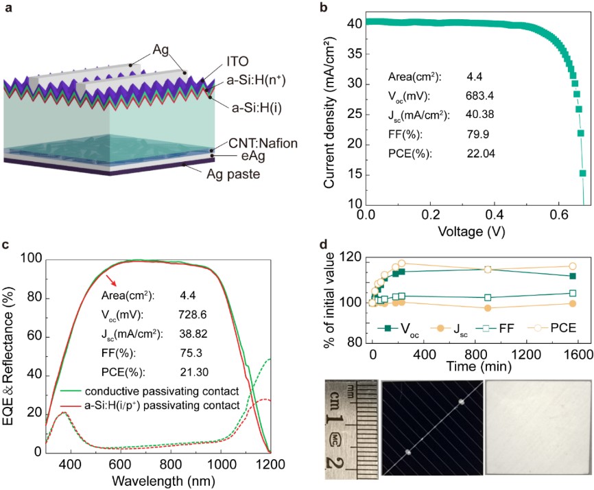 基于电化学铁电钝化机制的新型有机钝化技术是近年来由河北大学发现并逐步探索、拓展和深入研究的一个新方向。光伏中心陈剑辉等人对其物理本源、材料体系和应用领域等已初步形成较为完备的研究基础。去年,该课题组将有机钝化技术结合低维材料制备了新型低维-有机导电钝化接触硅太阳电池,有望降低硅太阳电池制造成本。但稳定性问题仍制约这种新型器件进一步发展。近期,该课题组通过发展溶剂工程和引入导电封装,避免了钝化效果峰值不能在器件端发挥最佳效果的缺点,从而获得了较高的开路电压,实现了这种新型电池稳定的、22%的电池效率[图1],目前仍保持碳硅异质结电池最高效率水平。