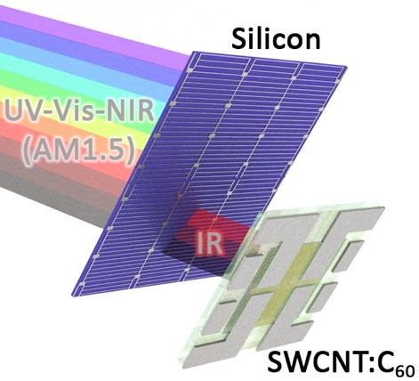 碳纳米管具有丰富的光学特性,通过合适的手性调节可吸收400~2000 nm范围内的太阳光谱。该课题组与德国卡尔斯鲁理工学院合作研究了基于(6,5), (7,6), (10,3)等手性的碳纳米管有机太阳电池,与双面发电的晶体硅太阳电池结合,制备成 “晶体硅/碳纳米管四端叠层电池”[图2],实现了晶体硅太阳电池光谱利用向红外波段的拓展。