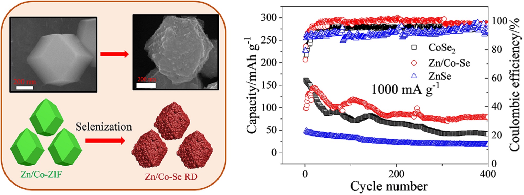 铝电池被认为是最有潜力的下一代二次电池,但铝电池正极材料容量衰减问题严重制约着其进一步的发展和应用。在此工作中,通过沸石咪唑骨架(ZIF)诱导成功制备了菱形十二面体双金属异质结构Zn/Co-Se。电化学分析发现,在此结构中金属Co参与电化学反应并提供容量,而Zn起稳定结构作用。因此,双金属异质结构Zn/Co-Se在铝电池中表现出较好的电化学性能,在提高和优化铝电池能量密度方面发挥重要作用。