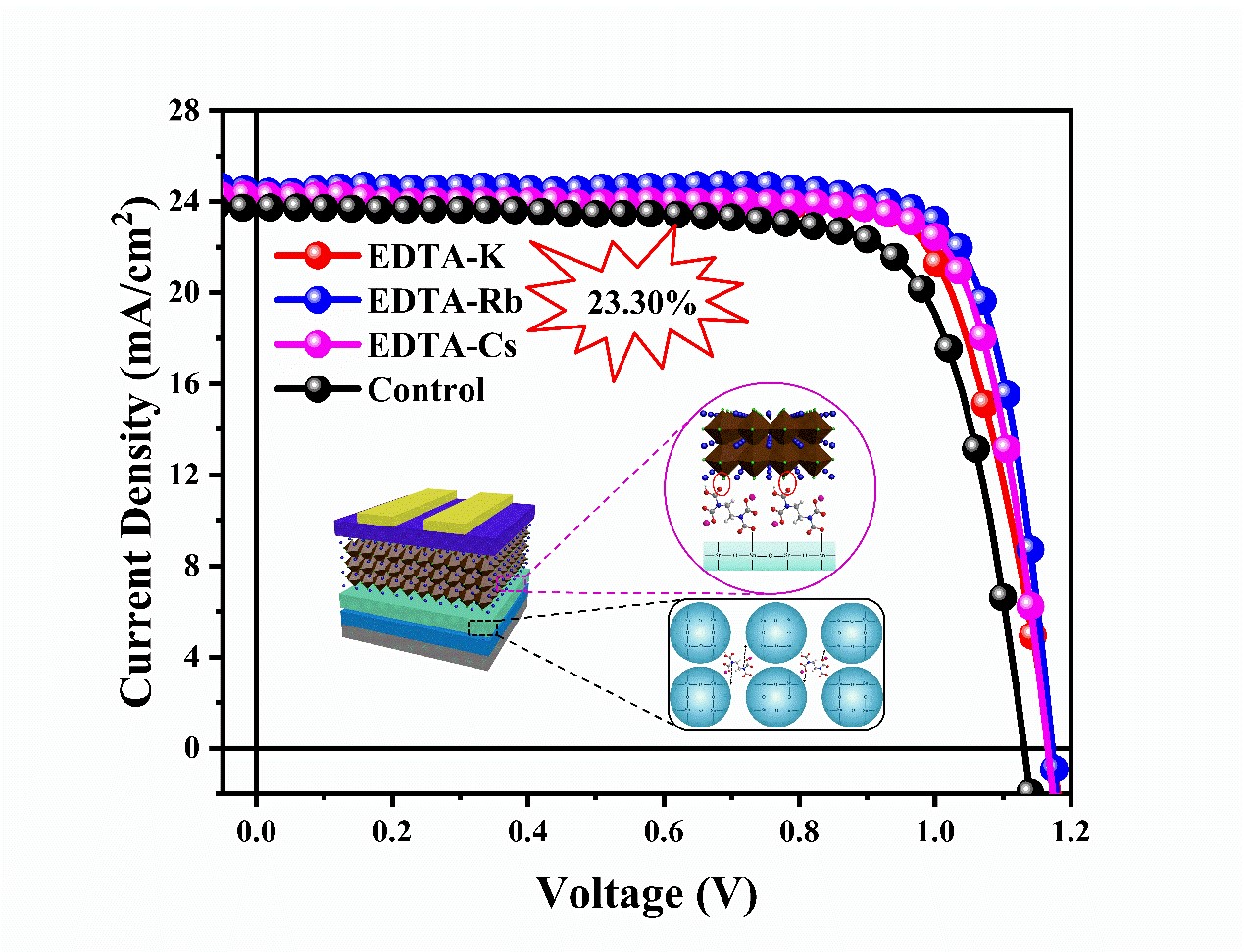 在第二项工作中,通过引入EDTA-2M(M为K、Rb或Cs)分子来稳定SnO2胶体,改善SnO2薄膜的电学和表面性能,进而修饰界面缺陷以及提高钙钛矿薄膜的质量,薄膜的电子迁移率从3.6×10-4 cm2V-1s-1增加到1.27×10-3 cm2V-1s-1。最终,基于1.57 eV 带隙的钙钛矿器件实现了23.30% (VOC=1.171V)的最优效率;基于1.69eV带隙的钙钛矿器件达到了19.76% (VOC=1.266V) 的效率。此外,EDTA-2M的引入还极大的改善了SnO2基未封装钙钛矿器件的稳定性。