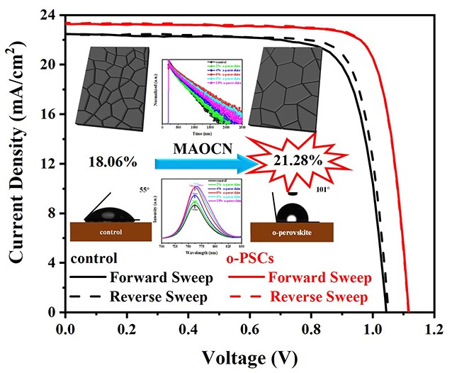 钙钛矿太阳电池作为光伏器件领域中的后起之秀,由于其优异的性能而备受关注。在本工作中,作者将甲胺氰酸盐(MAOCN)分子引入到MAPbI3钙钛矿前驱体溶液中减缓溶剂的挥发速率,延缓MAPbI3钙钛矿薄膜的结晶过程,制备出具有较低的缺陷密度和较长的载流子寿命的钙钛矿薄膜。最终使MAPbI3钙钛矿太阳电池器件效率达到了21.28% (VOC = 1.126 V, JSC = 23.29 mA/cm2, FF = 81.13%)。在大气条件下储存30天后,未封装的MAOCN基PSCs的效率仅下降约5%。