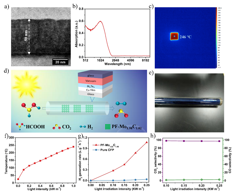 发展高效、低CO选择性的非贵金属催化剂实现甲酸脱氢反应对氢能源体系的发展至关重要。由于甲酸催化脱氢反应需要一定的加热温度,因此将甲酸脱氢反应器与光热系统进行耦合的策略具有很大的工业应用潜力,即通过自然太阳光来驱动甲酸热催化脱氢反应以降低催化的能源消耗,而这种方法在当前的研究中鲜有涉及。作者设计了一种基于Bi2Te3/Cu的光热器件,该器件表现出优异的高太阳光吸收率、低热传导和低热辐射的特点,可将1 kW m-2的太阳光辐照吸收并转化为240 ℃的高温。同时开发了碳纤维纸负载碳化钼多孔膜作为高效的甲酸热催化脱氢催化剂。并在此基础上,通过耦合甲酸热催化脱氢反应和光热器件,设计了日光驱动的甲酸热催化系统。在0.25 kW m-2下,H2生成速率为1.07 L g-1 h-1,这一数值比当前报道的非贵金属光催化剂的光催化甲酸分解速率快两个数量级。通过密度泛函理论计算发现,甲酸盐路线(*OCHOH→*OCOH+1/2H2→*OCO+1/2H2→CO2)是甲酸分解生成H2和CO2的最小能量路径。