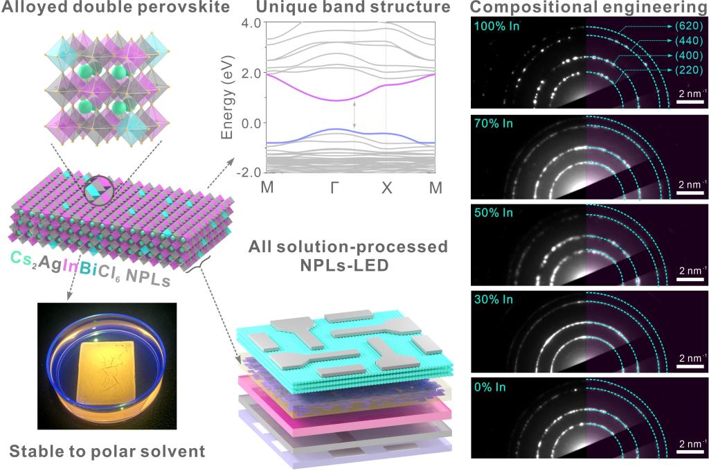 无铅双钙钛矿被视为最有希望替换铅卤钙钛矿的候选材料之一,有望从根本上解决铅卤钙钛矿的毒性及稳定性问题,具有广泛的光学和光电子应用前景。作者首次制备了具有良好形貌和组分可控的二维Cs2AgInxBi1-xCl6(0≤x≤1)合金双钙钛矿纳米片(NPLs)。所制备的NPLs具有独特的光学性质,其光致发光量子产率最高可达40.1%。变温光谱研究和密度泛函理论计算结果表明,二维形貌和In-Bi合金效应共同促进了合金双钙钛矿NPLs的自陷激子辐射复合。此外,NPLs对极性溶剂表现出良好的稳定性。基于优异的光学性能和极性溶剂稳定性,作者首次应用全溶液工艺构筑了基于该二维材料的电致发光器件,获得了稳定的电致发光。该项研究揭示了双钙钛矿纳米晶体的形貌/组分与光学性能的关系,为无铅钙钛矿材料在电致发光领域的应用提供了设计思路。