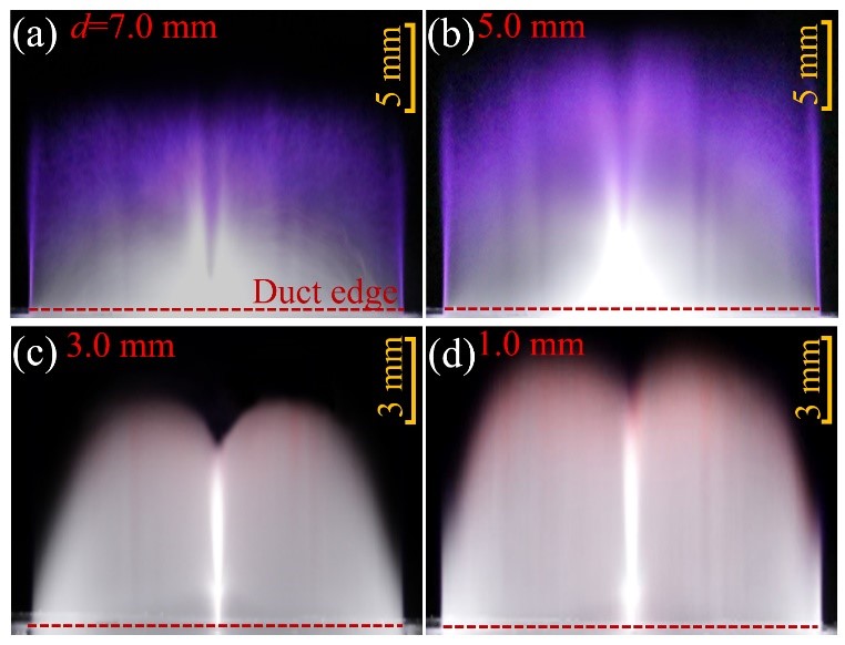 等离子体羽流富含丰富的活性粒子,在材料表面改性,活化净化水,促进伤口愈合,抑制癌细胞生长,流动控制等诸多领域都有广泛的应用。目前文献中只报道过单一模式的片状等离子体羽。该团队通过调节射流与矩形气道的距离,首次得到了两种模式的片状等离子体羽。研究表明,与流光模式相比,丝状模式的羽流具有更低的电子激发温度和分子振动温度,以及更高的谱线强度、电子密度和气体温度。这些结果对于等离子体羽流的实际应用具有重要意义。