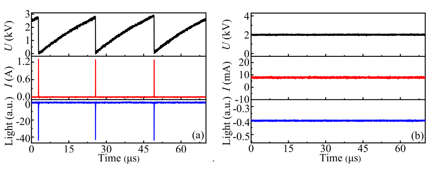 图2:微空心阴极射流的电压、电流及发光信号波形:(a)脉冲模式,(b)连续模式。
