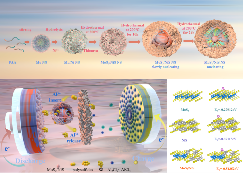 近年来,由于可充电铝电池优异的安全性能和极高的理论比容量,铝电池正极材料的开发变得极为关键和重要。在正极材料的结构设计中,黄壳结构具有大量的储存空间和丰富的活性位点,充分发挥了协同作用的优势,可构建出高性能的阴极结构。MoS2/NiS@S异质结界面有效地提高了单金属硫化物作为正极材料的导电性,提高了电极的电化学性能。理论计算和电化学表征证明了异质结的表面褶皱和孔隙为Al3+的自由插入和释放提供了极好的通道,降低了结合能并提高了Al3+的结合效率。因此其作为铝电池正极材料表现出优异的电化学性能,即使在500 mA g-1电流密度下,2000次循环后依旧保持了130.19 mAh g-1的可逆容量。实验结果为过渡金属硫化物材料的开发提供了新的思路。