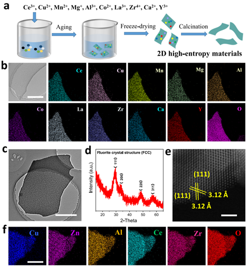 铜基纳米材料是众多光热催化的基准催化剂,受限于较低的塔曼温度(约400℃),铜基催化剂容易在高温光热催化过程中团聚失活,降低其使用寿命。协同增强铜基光热催化剂的催化稳定性和活性是面临的一个重大挑战。本工作中,李亚光与叶金花教授、张利强教授合作,采用聚乙烯吡咯烷酮(PVP)模板法合成了六元到十一元的高熵二维(2D)材料。经优化的铜基高熵二维材料在400-800℃之间保持结构稳定,且CO2加氢制CO性能在500℃时达到417.2 mmol g-1h-1。将铜基高熵二维材料与光热器件结合,在两个标准太阳光辐照下,光热催化CO2加氢制CO的生成速率达到248.5 mmol g-1h-1,光能到化学能转换效率为36.2%,连续7天的室外光热催化CO产量达到571 L。该研究结果表明高熵二维材料为协同提高催化剂的稳定性和活性提供了一条新路径,并扩展了光热催化的应用范围。